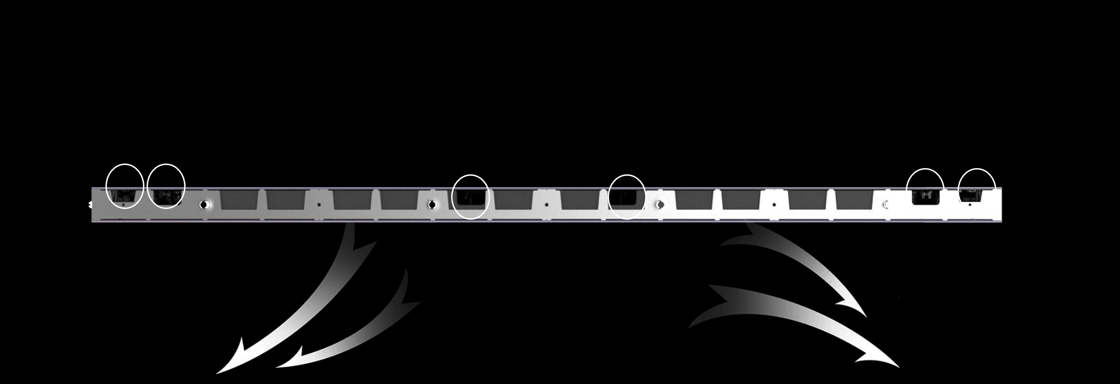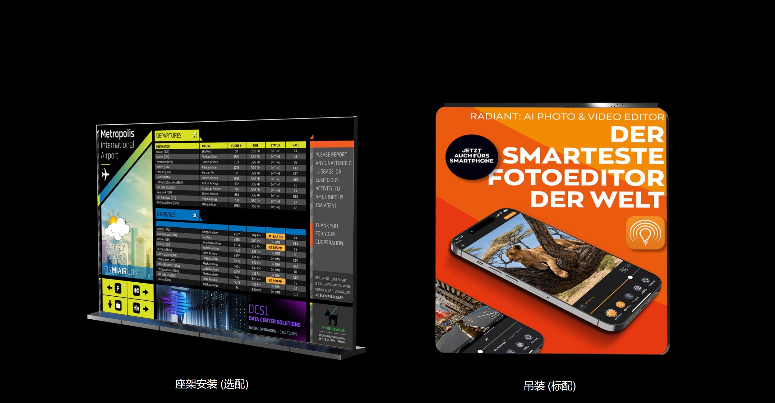 散热通风框设计。四周均设有高效散热孔,形成大面积散热区,提升显示稳定性