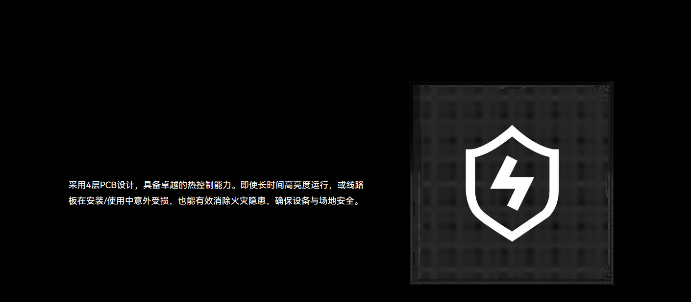 采用黑灯LED,即使在强光环境下依然清晰可见,散热效率大幅提升,确保高亮度运行时性能稳定不衰减,同时有效延长屏幕使用寿命。